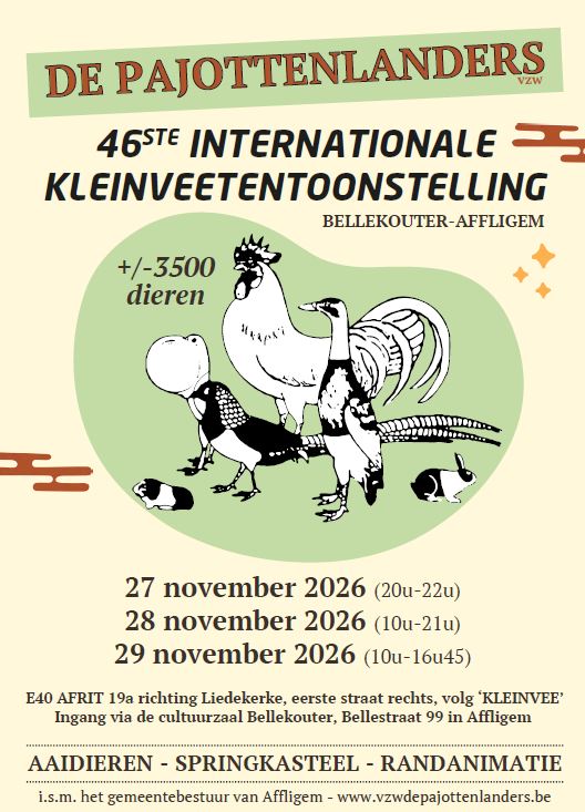Kleinveevereniging De Pajottenlanders vzw te Affligem (België) werd opgericht in 1978 en heeft momenteel ongeveer 200 leden. Het doel van onze vereniging is het bevorderen van het fokken en tentoonstellen van raszuivere dieren, met name, kippen, konijnen, duiven, park-en watervogels en cavia's. Deze doelstelling wordt bewerkstelligd door mensen die zich volledig belangeloos en gratis inzetten omdat het fokken van dieren hun hobby is.